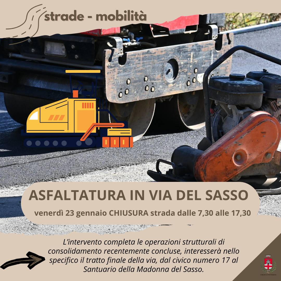 Venerdì 23 gennaio, dalle 07:30 alle 17:30, via del Sasso rimarrà chiusa al traffico nel tratto compreso tra il civico 17 e il Santuario della Madonna del Sasso. Il provvedimento è necessario per consentire i lavori di asfaltatura definitiva a completamento della messa in sicurezza del versante