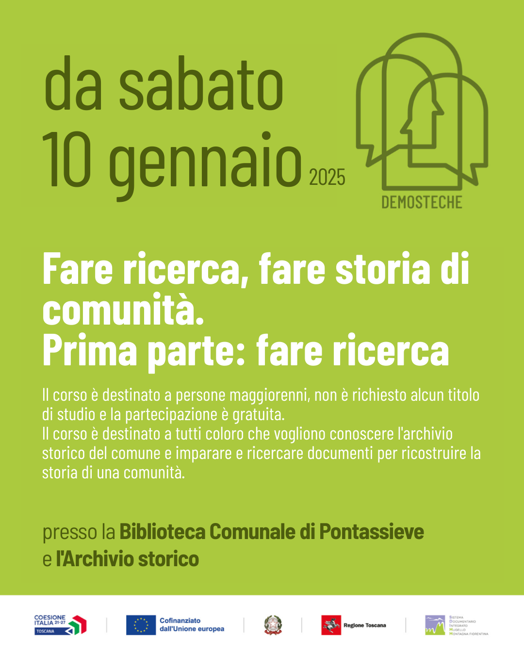 Il progetto DEMOS-TECHE. BIBLIOTECHE E ARCHIVI: SPAZI DI CRESCITA E INCLUSIONE è cofinanziato dal Fondo Sociale Europeo Plus 2021-2027 nell'ambito dell'avviso "Giovani e adulti in-formati", promosso dalla Regione Toscana come parte di COESIONE ITALIA 21-27. Il progetto trasforma le biblioteche e gli archivi del Sistema Documentario Integrato Mugello Montagna Fiorentina (SDIMM) in hub culturali per le comunità locali.