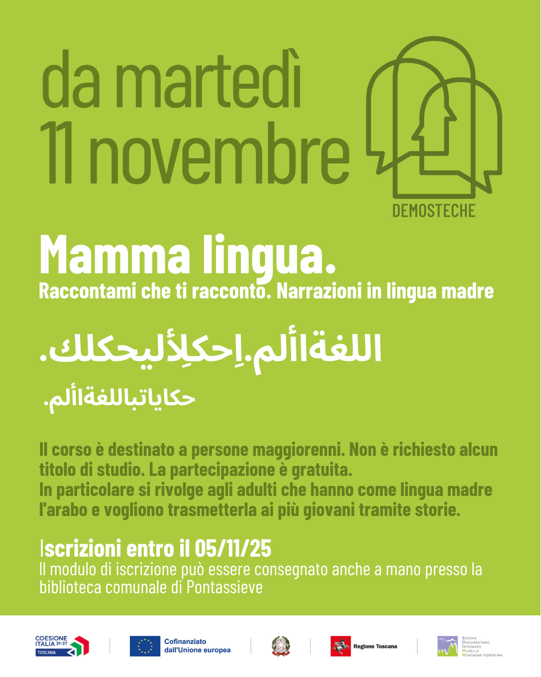 Il Comune di Pontassieve, in qualità di partner del progetto DEMOS-TECHE e facente parte dello SDIMM – Sistema Documentario Integrato Mugello e Montagna Fiorentina, promuove il corso gratuito "Mamma lingua. Raccontami che ti raccontò. Narrazioni in lingua madre".