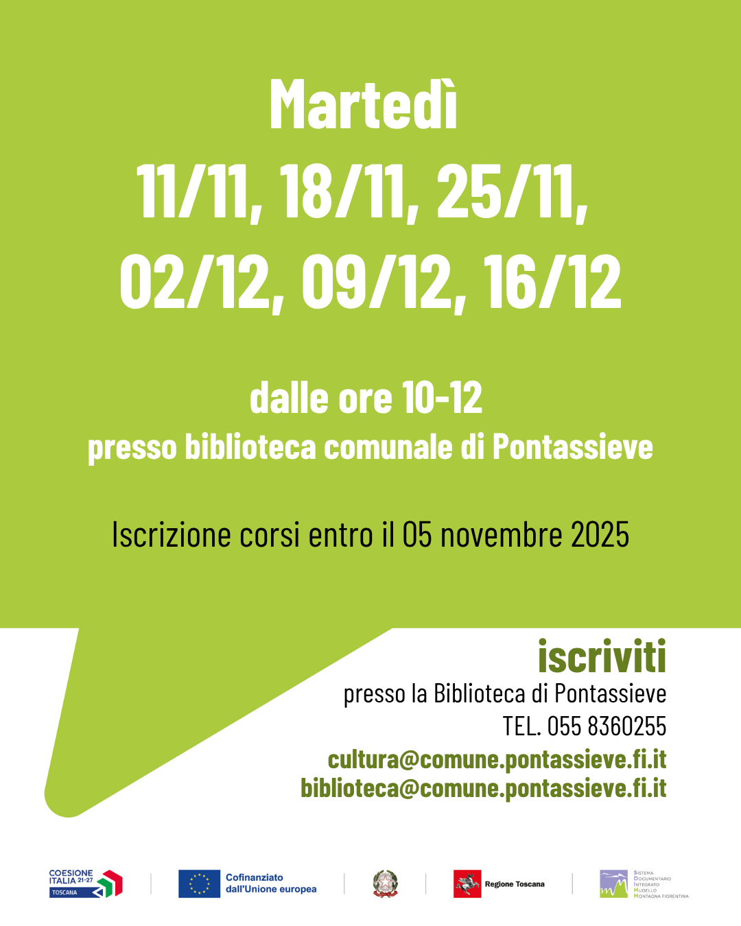 Per iscrizioni e ulteriori informazioni: Biblioteca Comunale di Pontassieve - TEL. 055 8360255