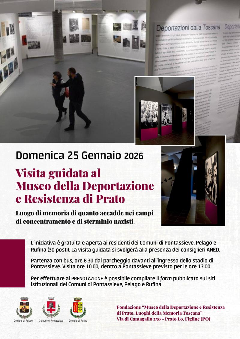 - La prima tappa è prevista per domenica 25 gennaio presso il Museo della deportazione e Resistenza di Prato (Via di Cantagallo 250, Prato). L’iniziativa è gratuita e aperta ai residenti dei Comuni di Pontassieve, Pelago e Rufina (fino a un massimo di 30 posti). La visita si svolgerà alla presenza dei consiglieri ANED. Il programma vedrà la partenza alle ore 8.30 con bus dal parcheggio davanti all'ingresso dello stadio di Pontassieve, inizio visita alle ore 10.00 e rientro previsto a Pontassieve per le ore 13.00. *** Tutti i posti disponibili sono esauriti ***