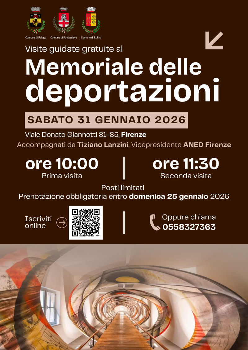- Sabato 31 gennaio il programma prosegue con due visite guidate gratuite al Memoriale delle deportazioni di Firenze (viale Donato Giannotti 81–85, Firenze). Il centro custodisce il celebre Memoriale originariamente allestito ad Auschwitz I. In questa occasione due turni disponibili, alle ore 10.00 e alle ore 11.30 (massimo 30 partecipanti per turno). Obbligatorie le iscrizioni da compilare entro il 25 gennaio tramite modulo online https://forms.gle/gBrBs7JdK29DsA2P9 contattando la segreteria del Sindaco di Pelago al numero 0558327363. Verrà data priorità ai residenti dei tre Comuni promotori.