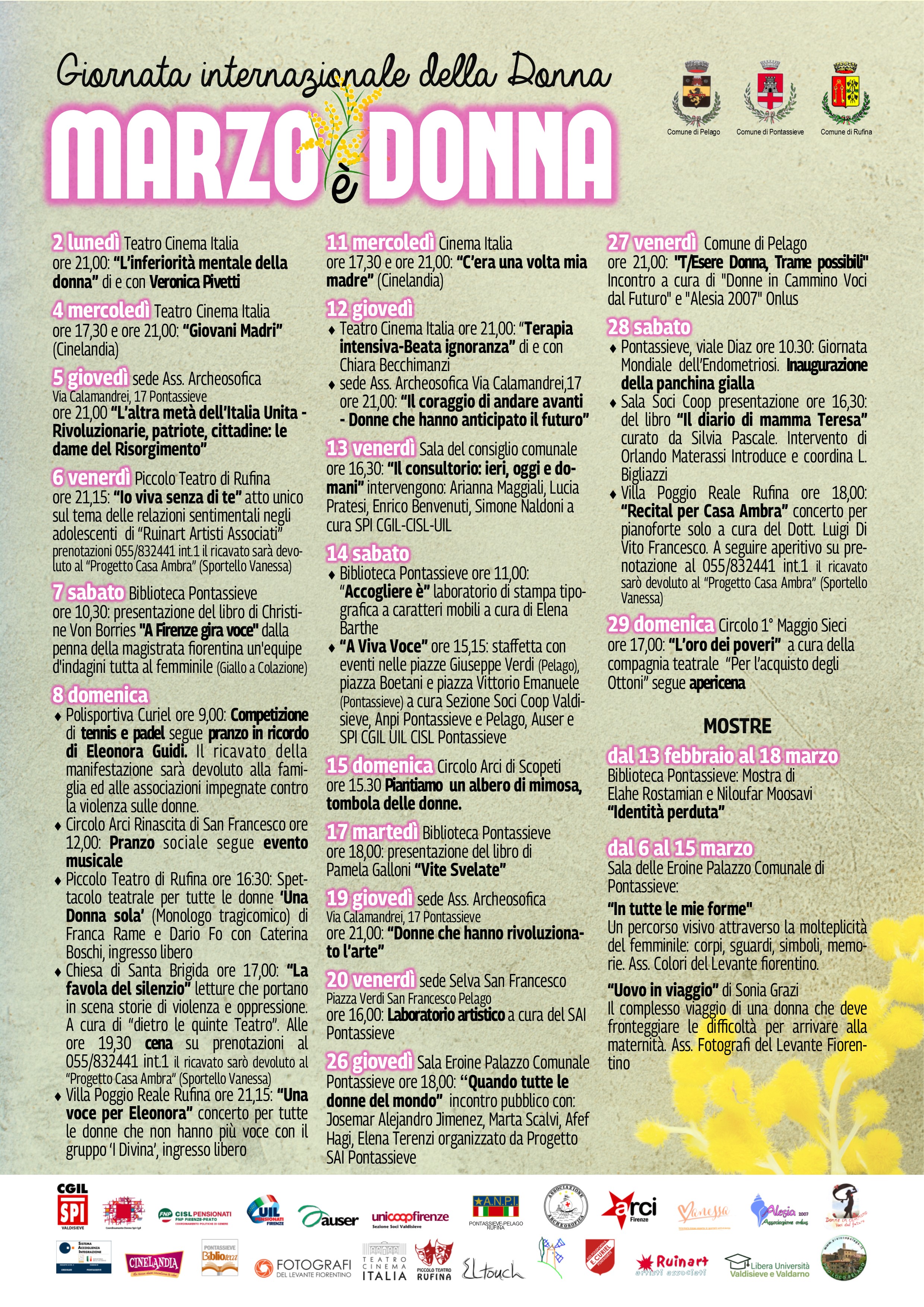 In occasione della Giornata Internazionale della Donna, i Comuni di Pelago, Pontassieve e Rufina, in stretta collaborazione con numerose realtà associative e sindacali del territorio, promuovono per tutto il mese di marzo la rassegna "Marzo è Donna". L'iniziativa si configura come un cartellone variegato che attraversa diverse discipline – dalla pittura al teatro, dagli incontri letterari al cinema – con l'obiettivo di riflettere sul ruolo della figura femminile nella società, celebrarne i traguardi e mantenere alta l'attenzione sul contrasto alla violenza di genere.