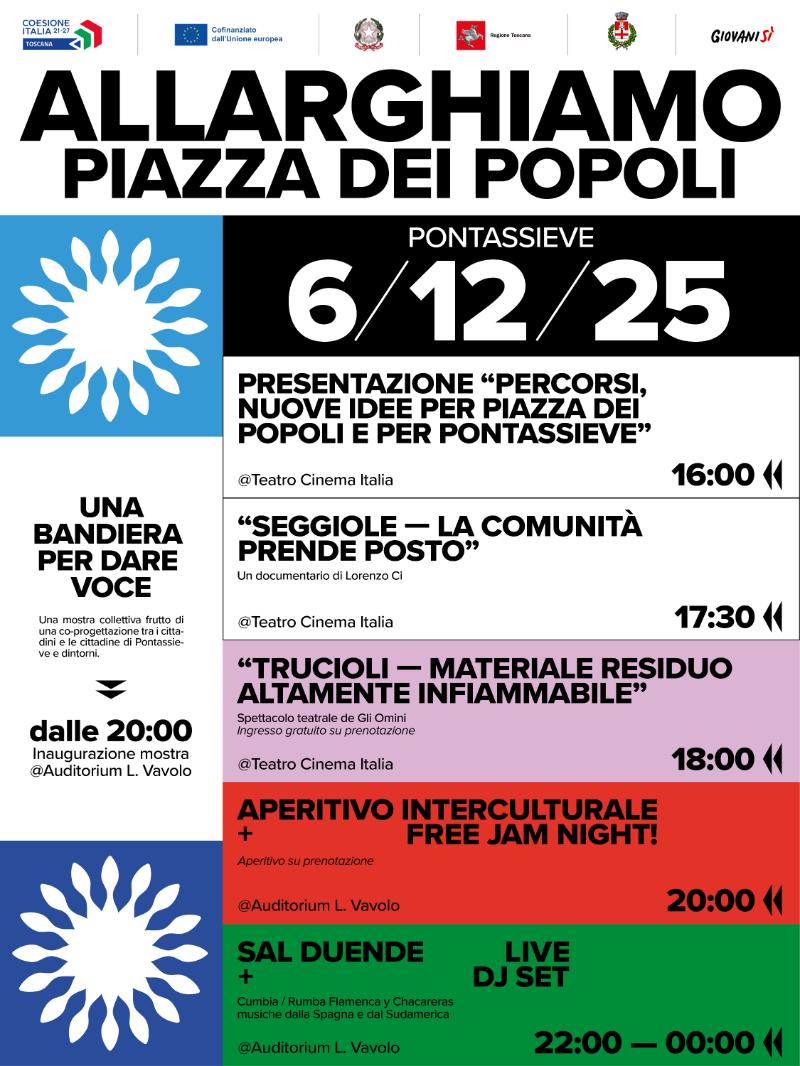 Sabato 6 dicembre dalle 16:00 Pontassieve si anima con musica, arte e cibo grazie a un programma di eventi ideati e realizzati dalle persone che hanno partecipato a Percorsi, nuove idee per Piazza dei Popoli e per Pontassieve, ciclo di incontri nato per raccogliere proposte e dare vita a un calendario condiviso di iniziative culturali.
