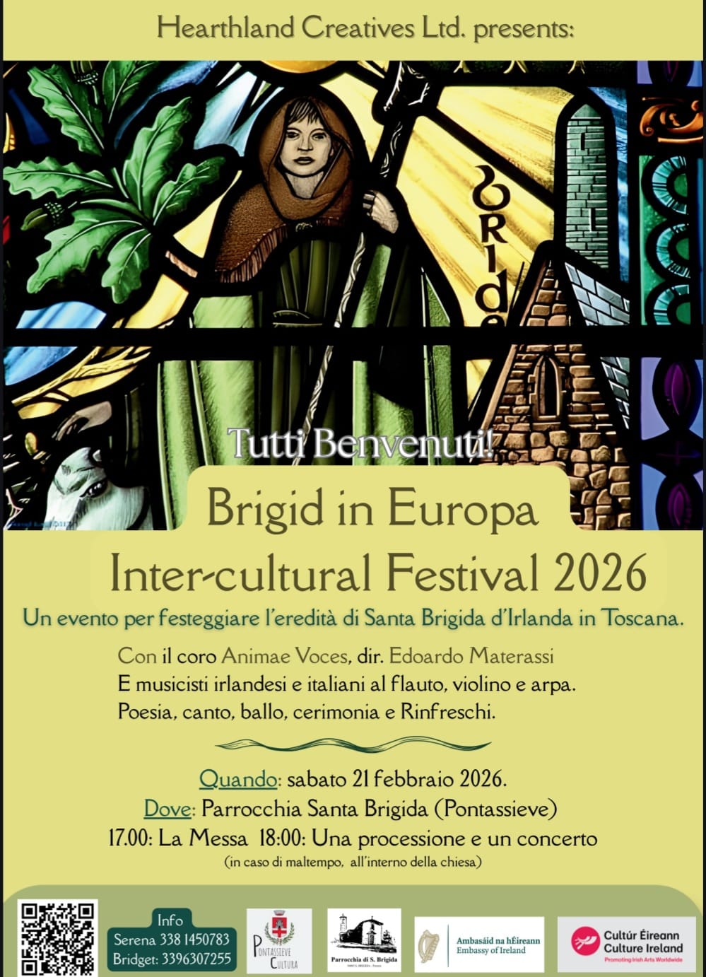 Sabato 21 febbraio la frazione di Santa Brigida nel Comune di Pontassieve ospiterà la terza edizione del festival interculturale "Brigid in Europa". L'evento, organizzato da Hearthland Creatives Ltd. in collaborazione con la Parrocchia di Santa Brigida e con il patrocinio delle istituzioni locali e dell’Ambasciata d’Irlanda, celebra il legame storico e spirituale tra la comunità toscana e la Santa d'Irlanda. L'iniziativa mira a consolidare un dialogo culturale che vede coinvolte attivamente le realtà locali e la contea di Mayo, trasformando una ricorrenza religiosa in una solida tradizione di scambio tra i due popoli.