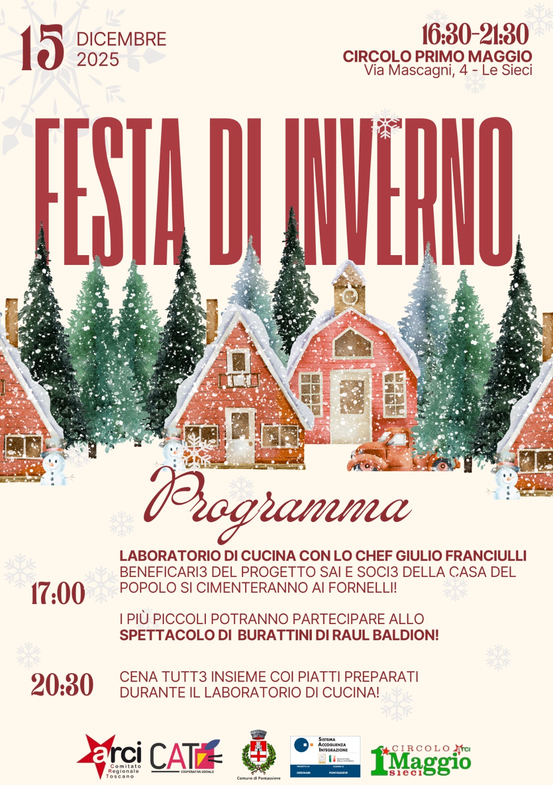 Il Progetto SAI (Sistema di Accoglienza e Integrazione), insieme ad ARCI e cooperativa CAT promuove la "Festa di Inverno", un evento serale incentrato su inclusione, gastronomia e intrattenimento, in collaborazione con il Comune di Pontassieve e il Circolo Primo Maggio. L'appuntamento è fissato per il 15 dicembre dalle 16:30 alle 21:30, presso il Circolo Primo Maggio in Via Mascagni, 4 – Le Sieci, con l'obiettivo di celebrare la coesione sociale e l'avvicinamento delle festività.