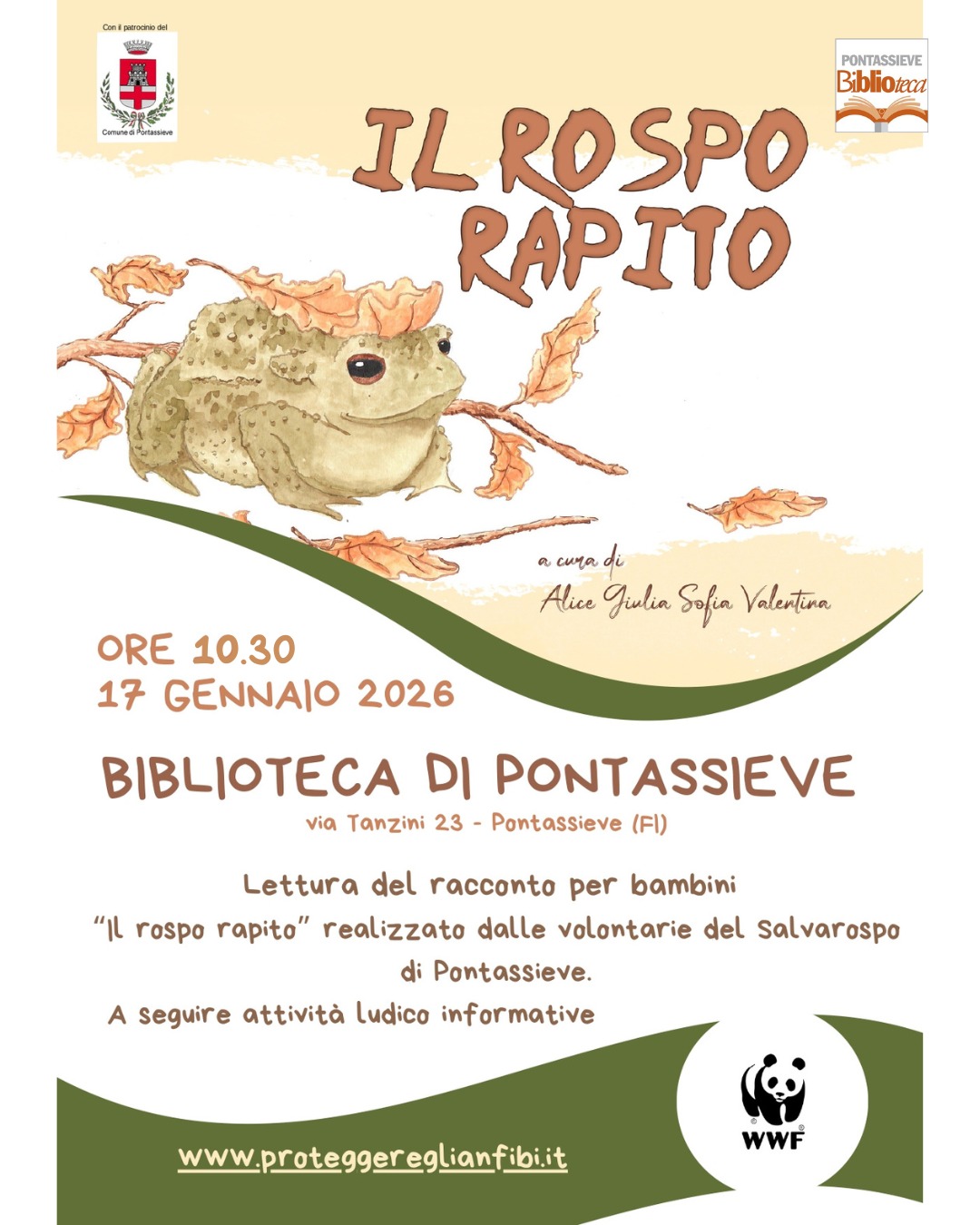 Sabato 17 gennaio alle ore 10.30, la Biblioteca di Pontassieve ospiterà l'iniziativa dedicata ai bambini intitolata "Il rospo rapito". L’evento nasce per coniugare l'intrattenimento educativo con la sensibilizzazione ambientale, focalizzandosi sulla salvaguardia degli anfibi nel territorio.