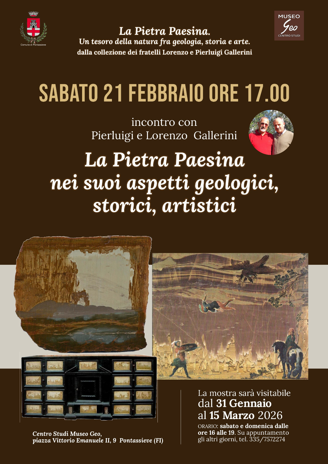 Sabato 21 febbraio alle ore 17:00, al Centro Studi Museo Geo di Pontassieve, si terrà un incontro speciale con Pierluigi e Lorenzo Gallerini dedicato alla Pietra Paesina. L’appuntamento si inserisce nel quadro della mostra "La Pietra Paesina. Un tesoro della natura fra geologia, storia e arte", in corso al museo GEO e offre al pubblico l'opportunità di approfondire gli aspetti scientifici, storici e artistici di questo straordinario materiale lapideo direttamente con i curatori della collezione.