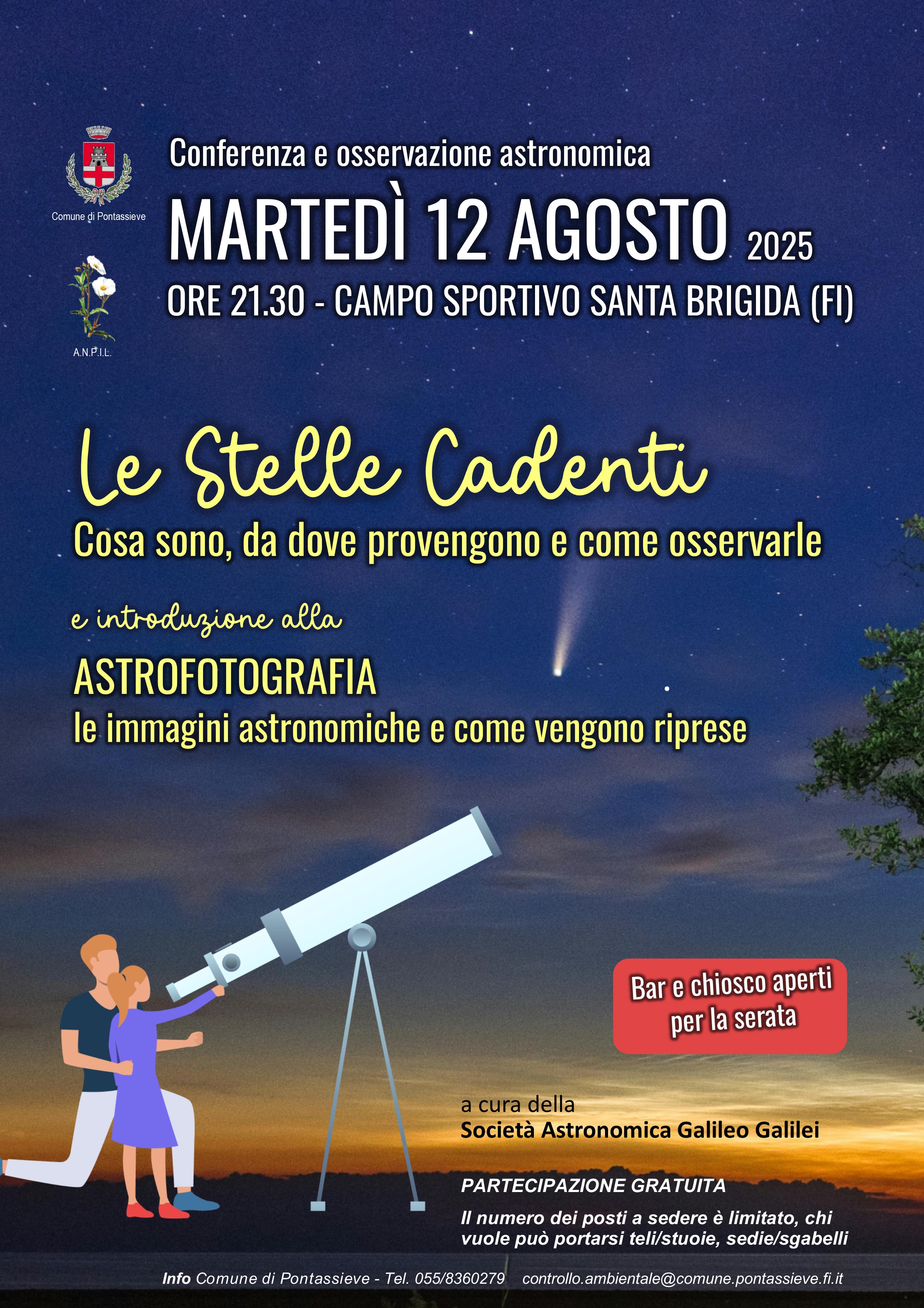 In occasione delle notti delle stelle cadenti, l’Amministrazione comunale di Pontassieve invita cittadini e appassionati a una serata speciale di divulgazione astronomica, in programma martedì 12 agosto alle ore 21.30, presso il campo sportivo di Santa Brigida.