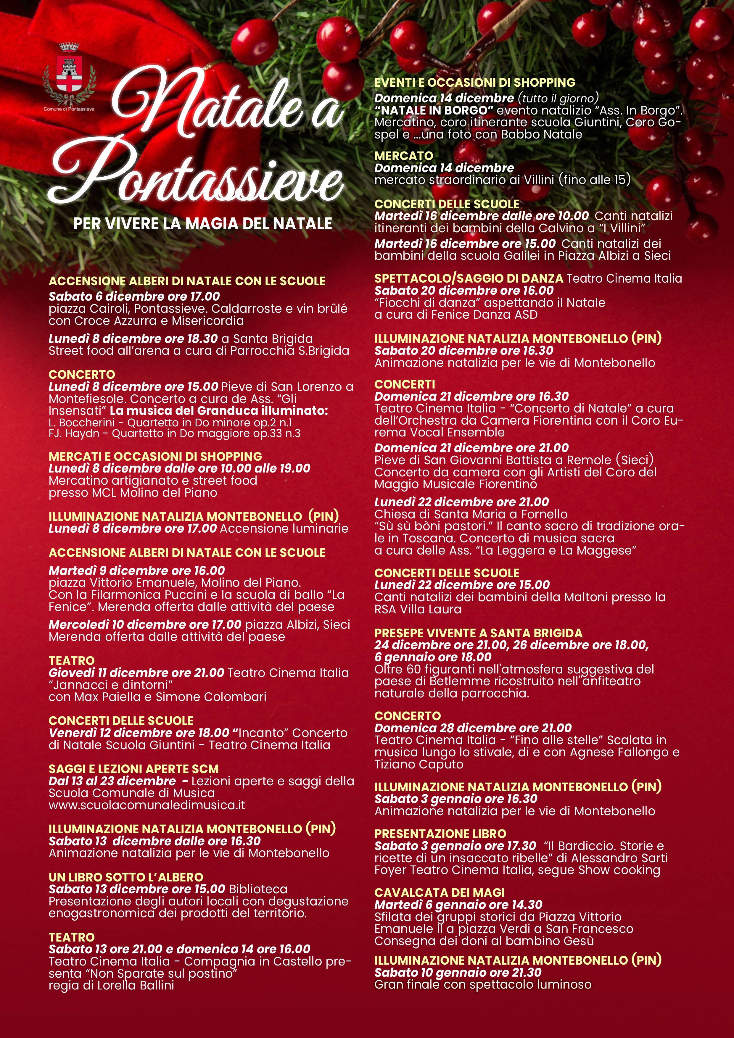 Le iniziative insieme a tante realtà associative del territorio spaziano dalle cerimonie di accensione degli alberi con le scuole, ai mercatini, dai concerti di musica sacra e da camera fino al tradizionale Presepe Vivente di Santa Brigida e alla Cavalcata dei Magi che attraverserà il Borgo di Pontassieve, passando per i giochi di luce delle luminarie, il tutto creando un'atmosfera suggestiva in ogni frazione.