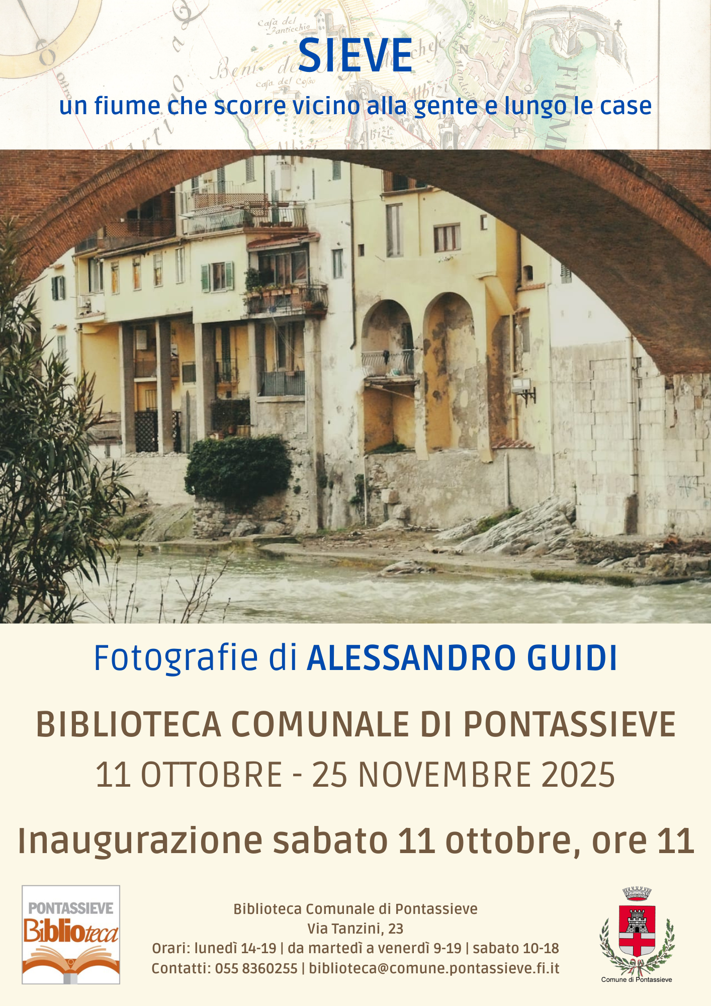 Dall’11 ottobre al 25 novembre 2025, la Biblioteca Comunale di Pontassieve ospiterà la mostra fotografica “Sieve: un fiume che scorre vicino alla gente e lungo le case”, con gli scatti di Alessandro Guidi.