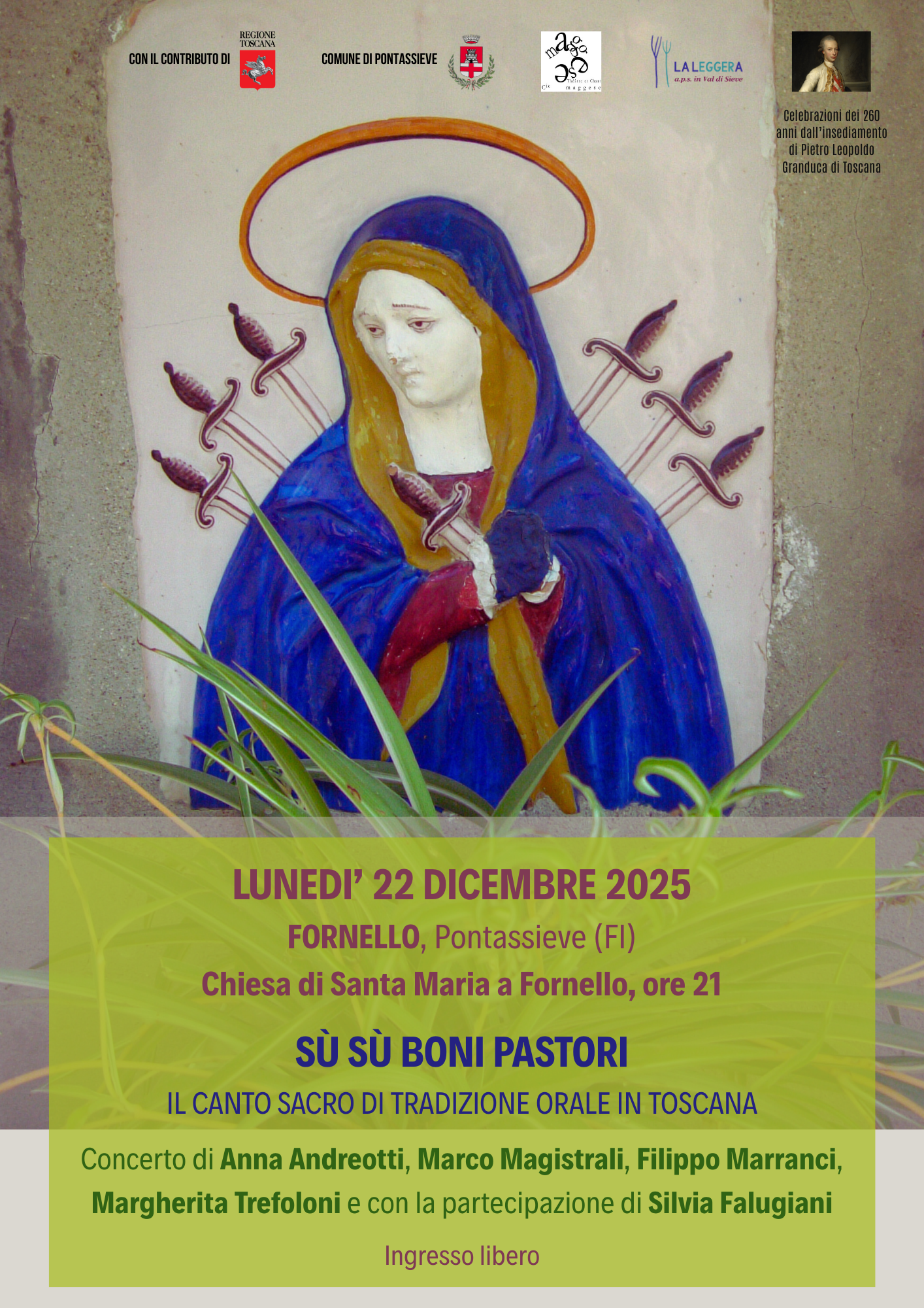 Il patrimonio del canto sacro di tradizione orale in Toscana sarà protagonista del concerto "Sù sù boni pastori", che si terrà lunedì 22 dicembre alle ore 21:00, presso la Chiesa di Santa Maria a Fornello a Pontassieve. L’iniziativa è promossa dalle associazioni "La leggera" e "La Maggese" e si inserisce nelle celebrazioni regionali per i 260 anni dall'insediamento del Granduca Pietro Leopoldo.
